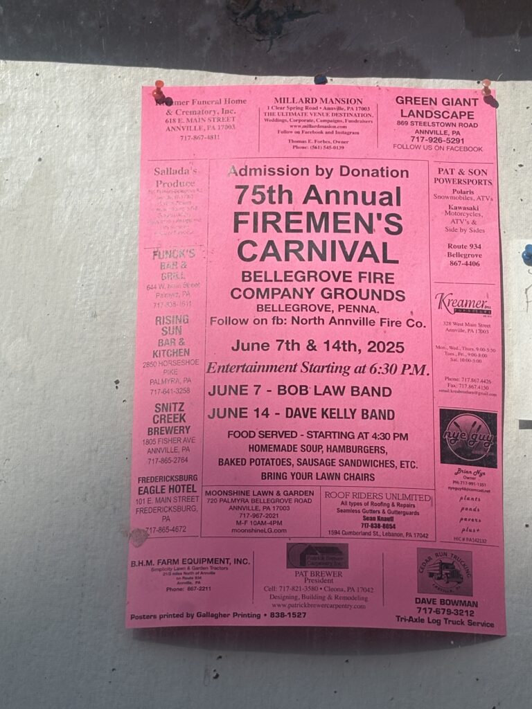 On June 7 and 14, Bellgrove Fire Company will sponsor what’s billed as its 75th anniversary fire carnival and the first under its new name, North Annville Fire Company. (On Jan. 1 of this year, Bellegrove merged with neighboring Union Water Works Fire Company to become North Annville Fire Company.)