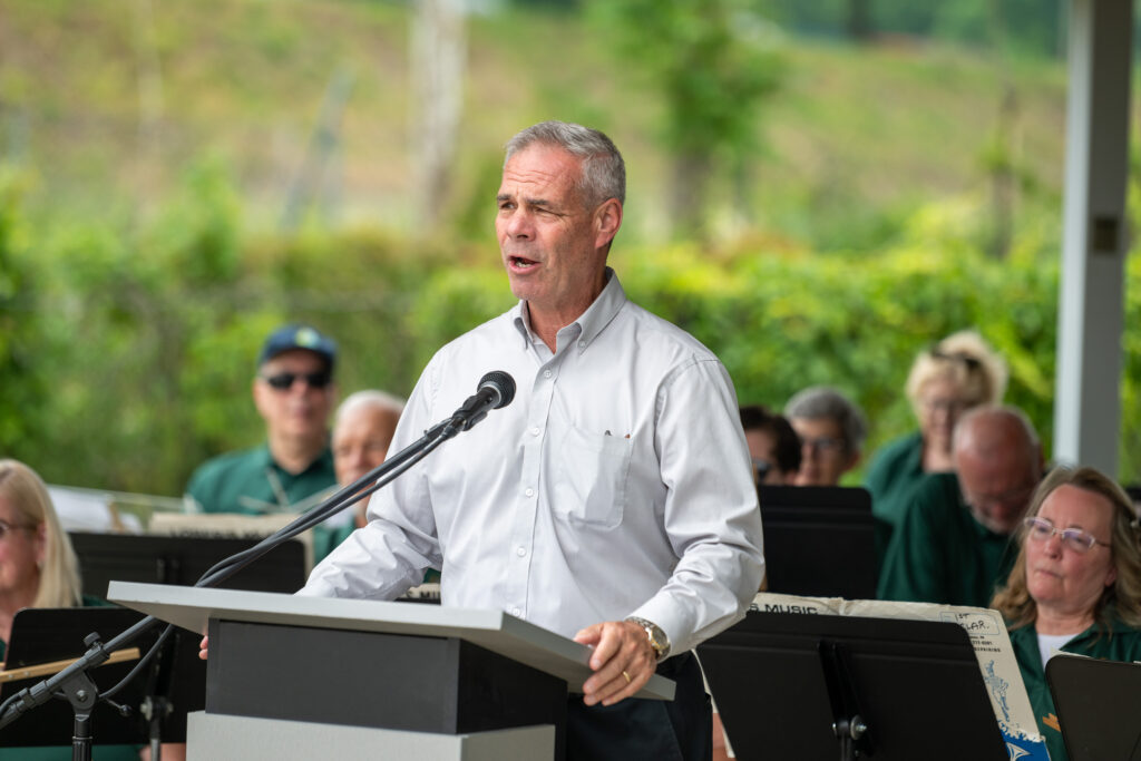 He then unrolled a scroll that he said contained the many funding sources available for projects like the rail trail and the park. The scroll ran over the top of the lectern and finished unfurling on the ground below, which made the audience laugh. Turning serious again, John B. thanked PennDOT secretary Larry Shifflet for providing state funding over the years for the rail trail project.