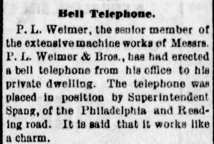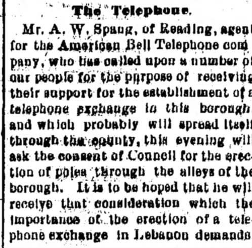 While phones have become ubiquitous in the modern day, it took a few years for the invention to reach Lebanon County. According to Lebanon Daily News archives, the first local Bell Telephone was installed between the office and home of P.L. Weimer in 1879.