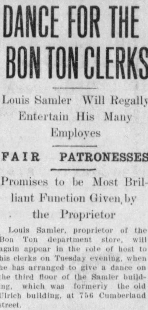 A 1909 Daily News article describes a dance held by Samler in the Samler building, attended by over 70 Bon Ton employees and their wives.