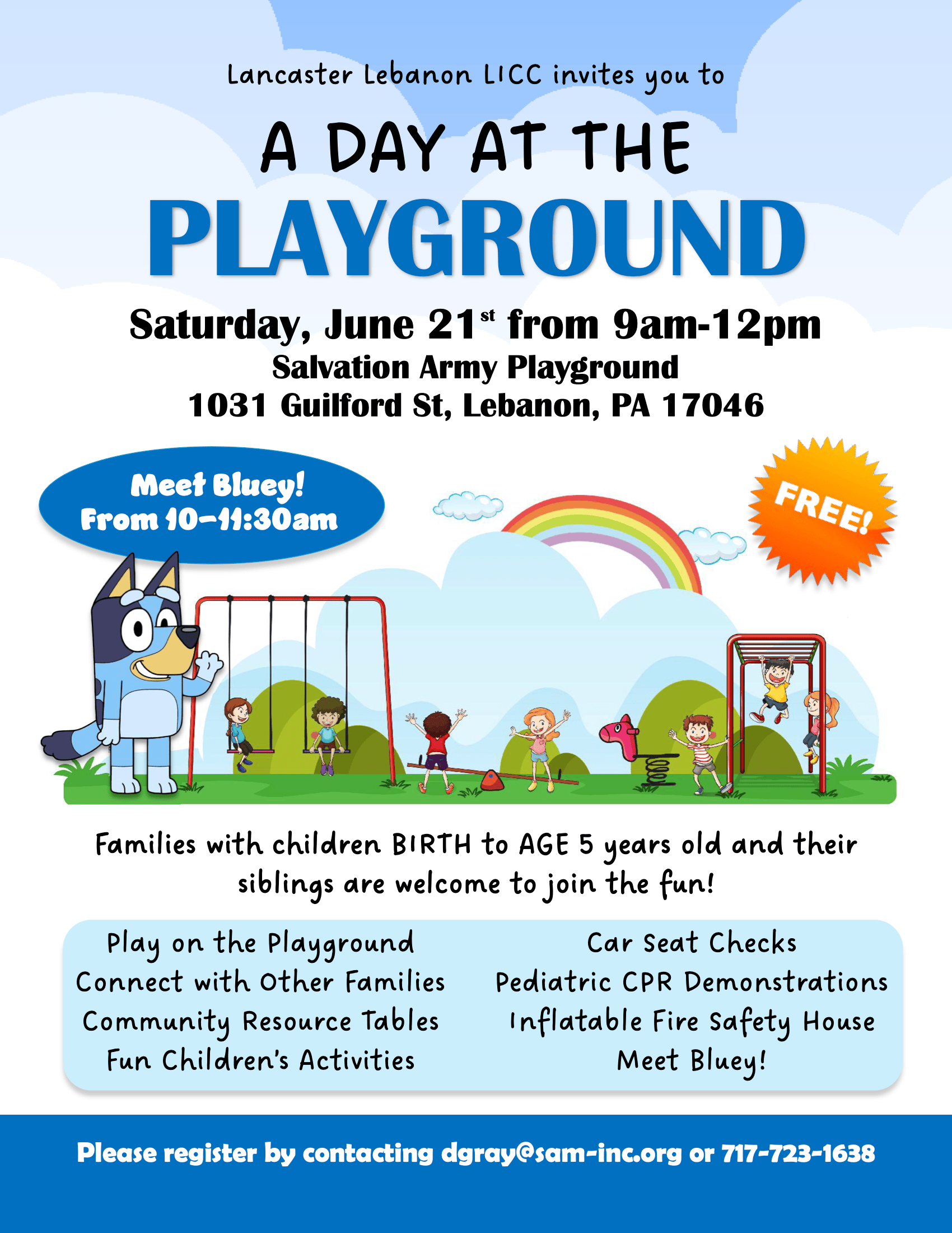 The Lebanon County Early Intervention Program (EI), in conjunction with the Lancaster-Lebanon Interagency Coordinating Council (LICC), will be hosting our third Annual Family Playground Event – a family connection event for families served in EI. This event will take place at the Salvation Army Playground located at 1031 Guilford Street, Lebanon, 17046 on Saturday, June 21 from 9 a.m. to 12 p.m.