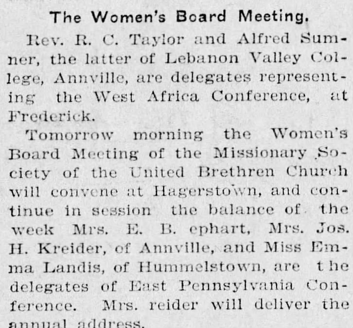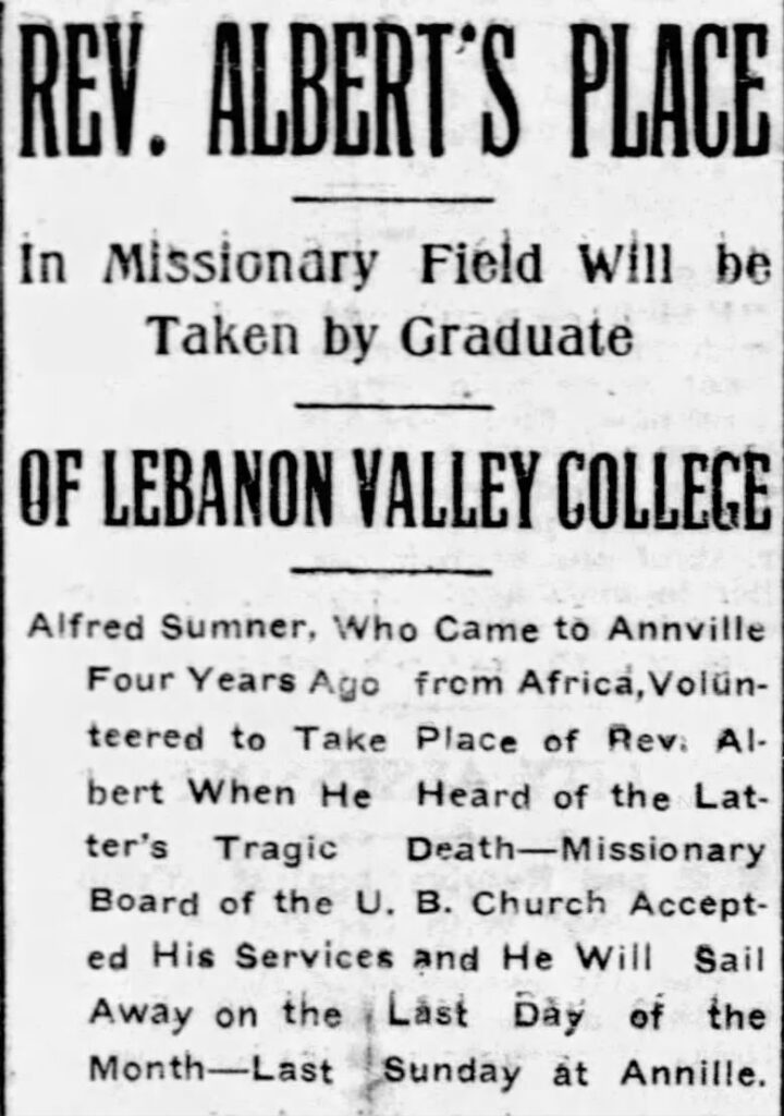 However, when Rev. Ira Albert, a missionary working in Africa from Lebanon County, died in November 1902, Sumner volunteered to take Albert’s place.