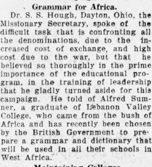 In the following years, Sumner wrote “a grammar and dictionary that [would] be used in all [the British Government’s] schools in West Africa,” according to a 1918 LDN article.