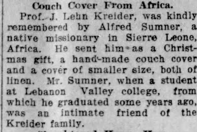 Though there’s no evidence Sumner ever returned to the U.S., he did not forget his time in Annville; in 1918, he mailed a former professor a hand-made couch cover, which was reported on by LDN.