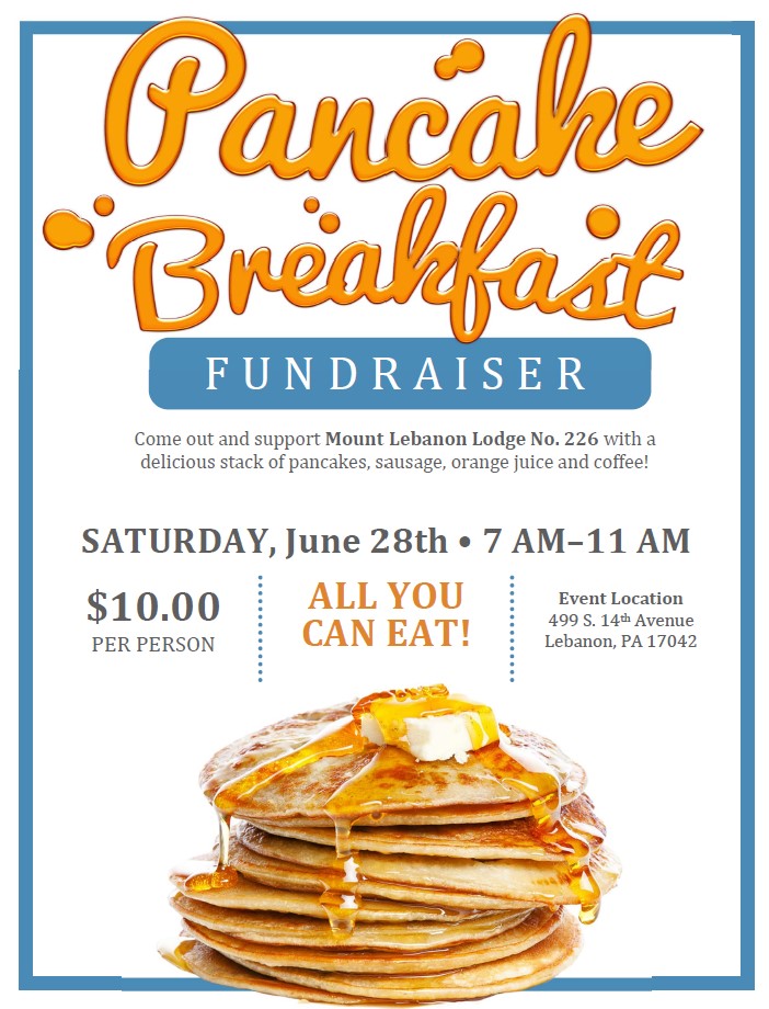 Mount Lebanon Lodge No. 226 will be hosting a Pancake Breakfast in the lodge Social Hall on June 28, 2025 from 7:00 a.m. to 11:00 a.m.