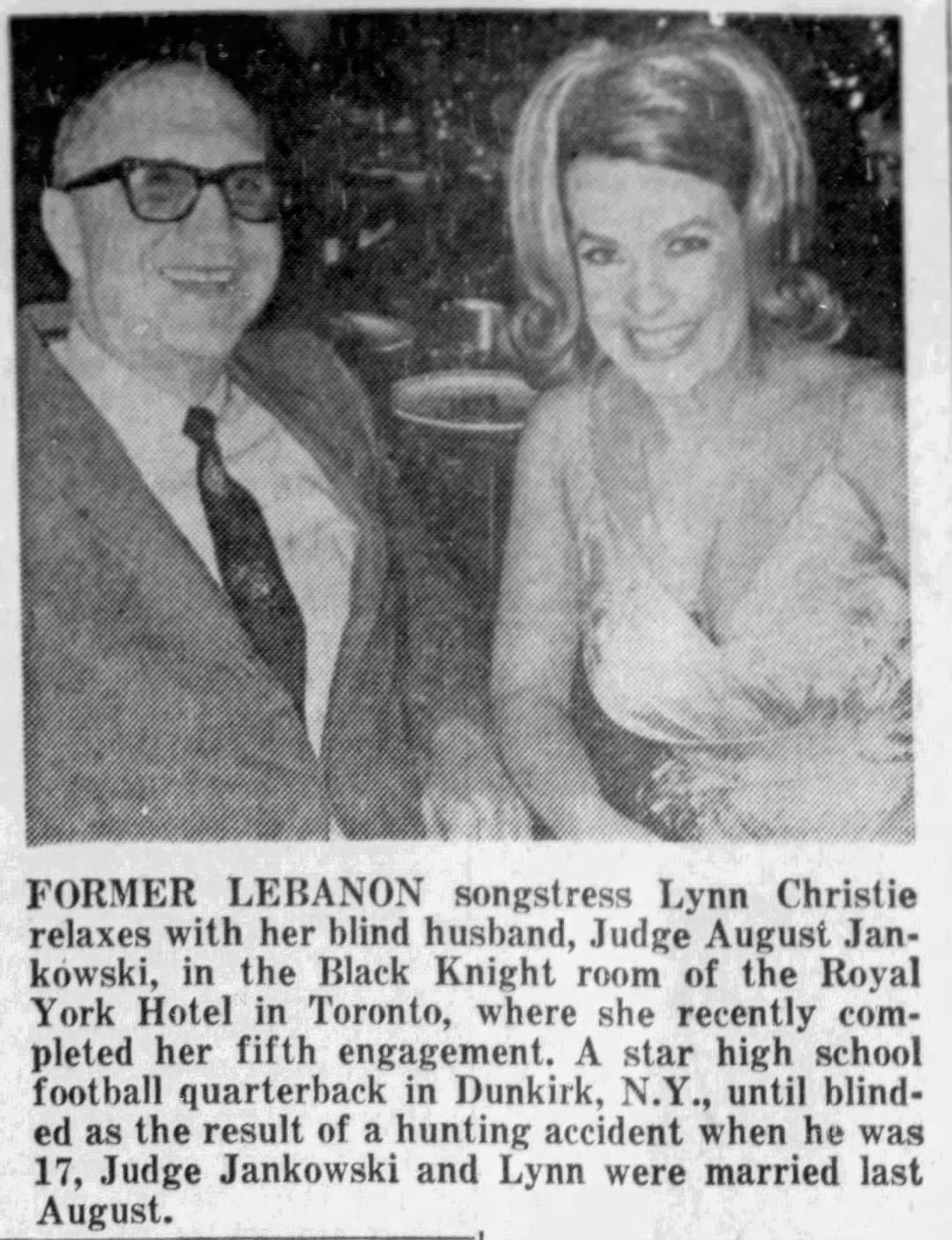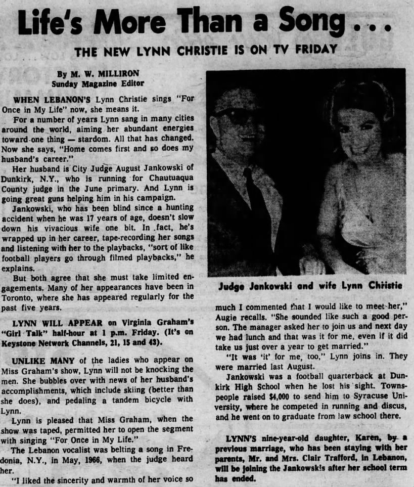 Christie continued to perform throughout the ’60s, eventually meeting her future husband, New York City Judge August Jankowski, after a performance in Freedonia, New York.