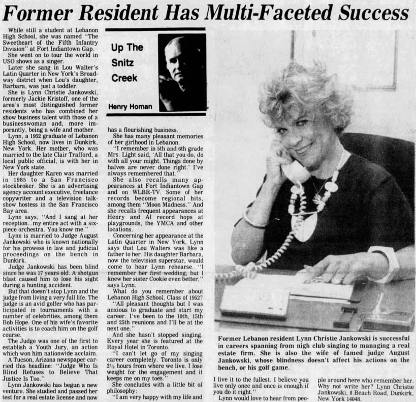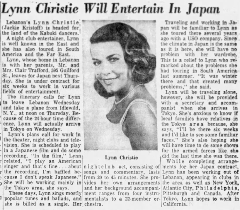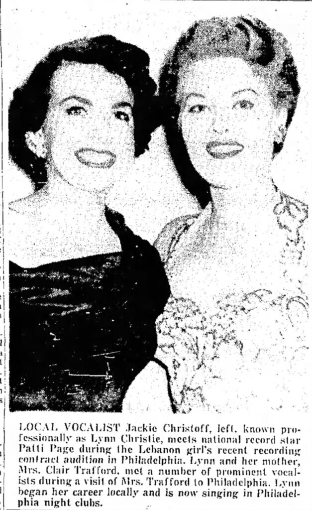 Despite humble beginnings performing at the Fort Indiantown Gap Military Reservation, Jackie Christoff Jankowski — stage name Lynn Christie — found success as a singer, performing in Japan, Buenos Aires, Canada, and throughout the United States during the 1950s and ’60s.