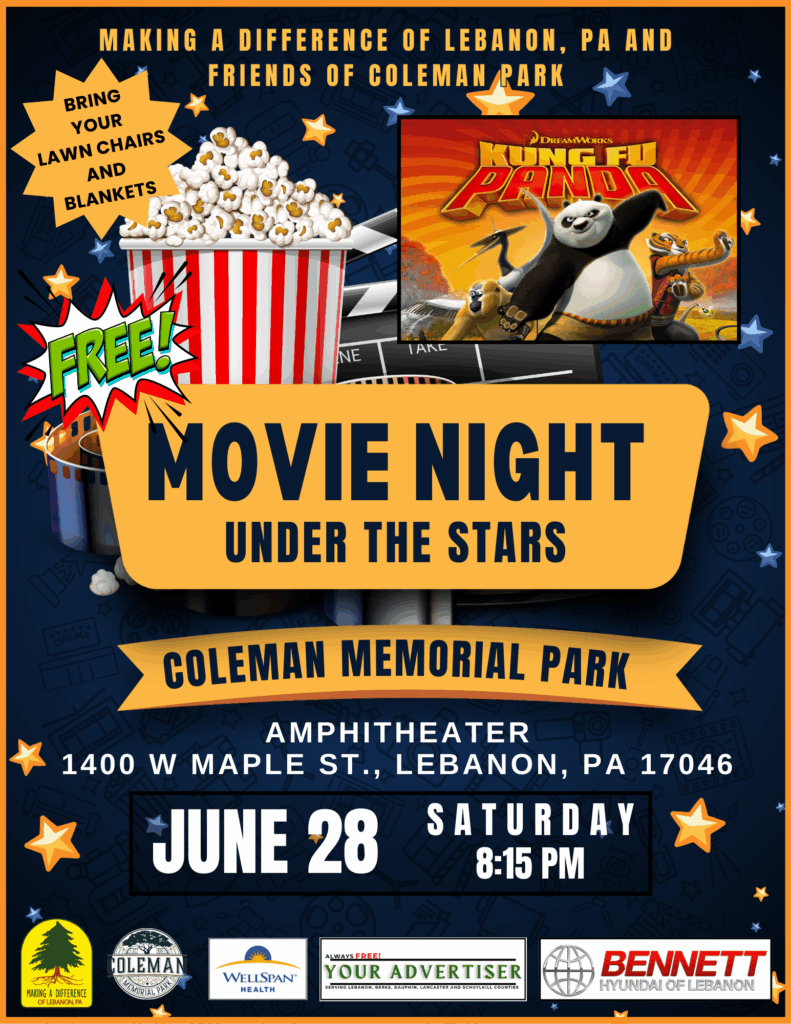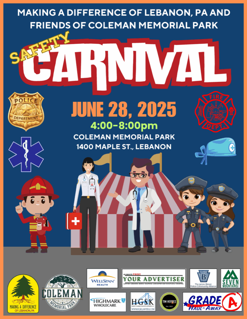 Making a Difference of Lebanon, PA, in partnership with Friends of Coleman Memorial Park, is proud to announce its first-ever Safety Carnival, taking place on Saturday, June 28, 2025, from 4:00 p.m. to 8:00 p.m. at Coleman Memorial Park—with a free Movie in the Park screening of Kung Fu Panda to follow at sundown.