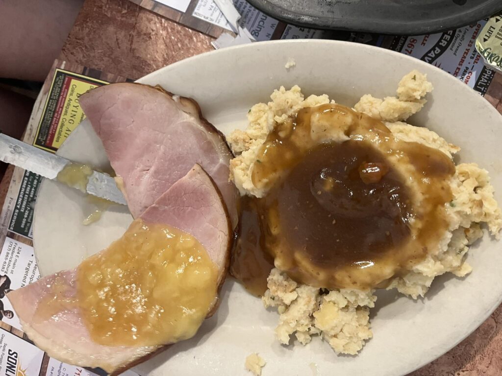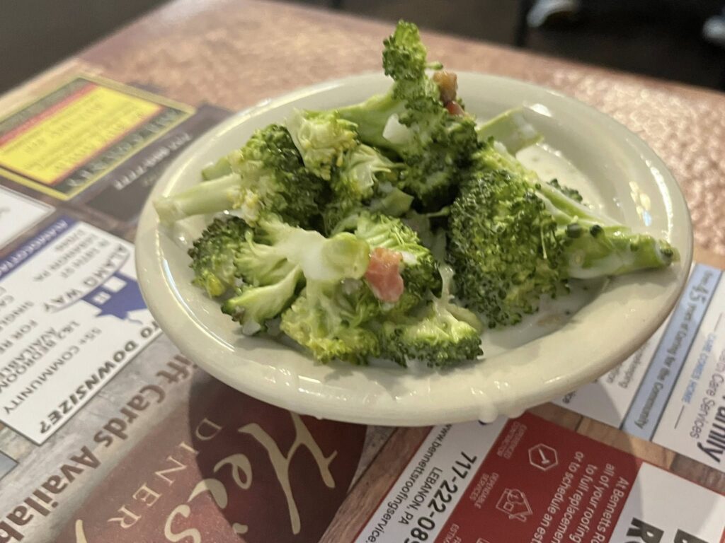 Our dinner for this evening was the Broiled Crab Cake ($17.95) with potato filling and broccoli salad, the Heisey’s Boom Boom Burger ($8.95), and the kids Baked Ham with pineapple slices ($5.75).