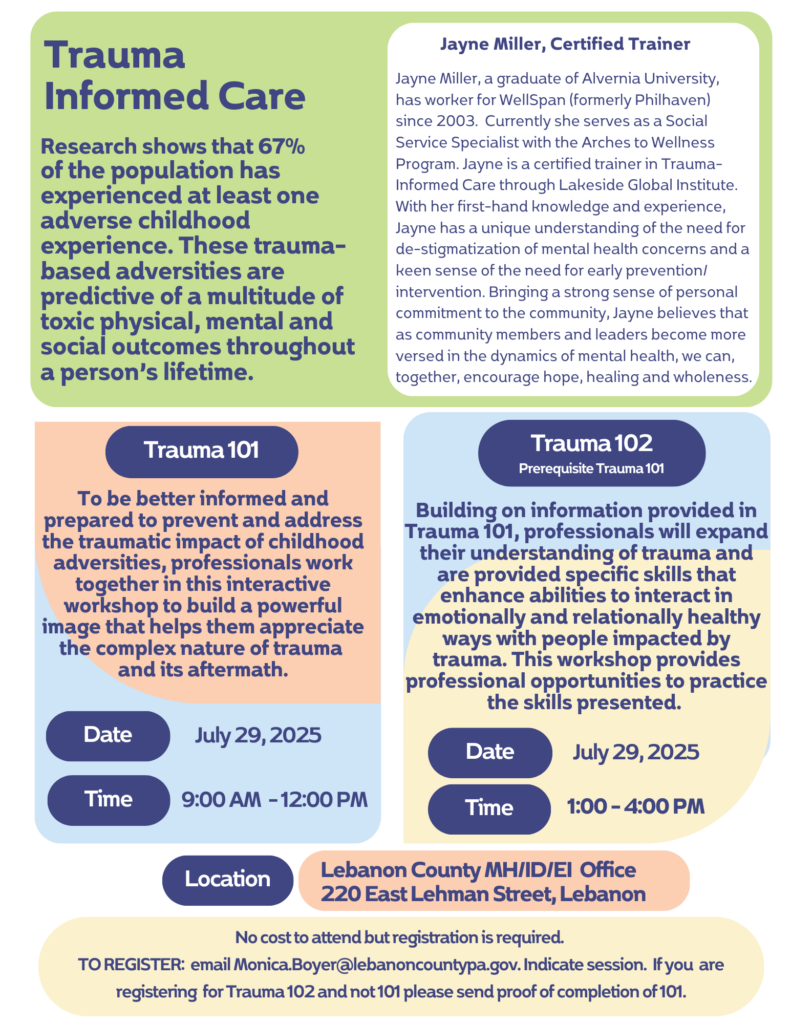 The Lebanon County MH/ID/EI Program will host two comprehensive trauma-informed care workshops on July 29, led by certified trainer Jayne Miller. The sessions, taking place at 220 East Lehman Street, will provide professionals with tools to address traumatic childhood experiences and their lasting impacts.