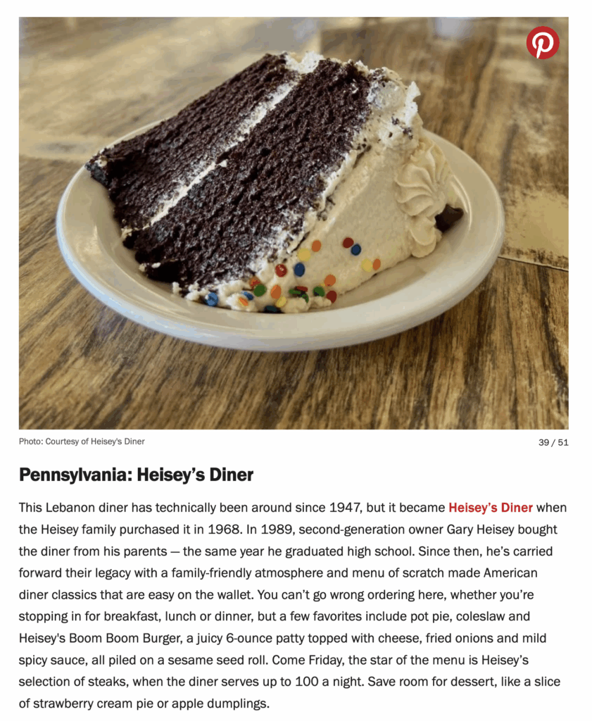 The Food Network highlighted Heisey’s pot pie, coleslaw, and burgers, as well as its Friday night steak dinners. “You can’t go wrong ordering here, whether you’re stopping in for breakfast, lunch or dinner,” said the Food Network.