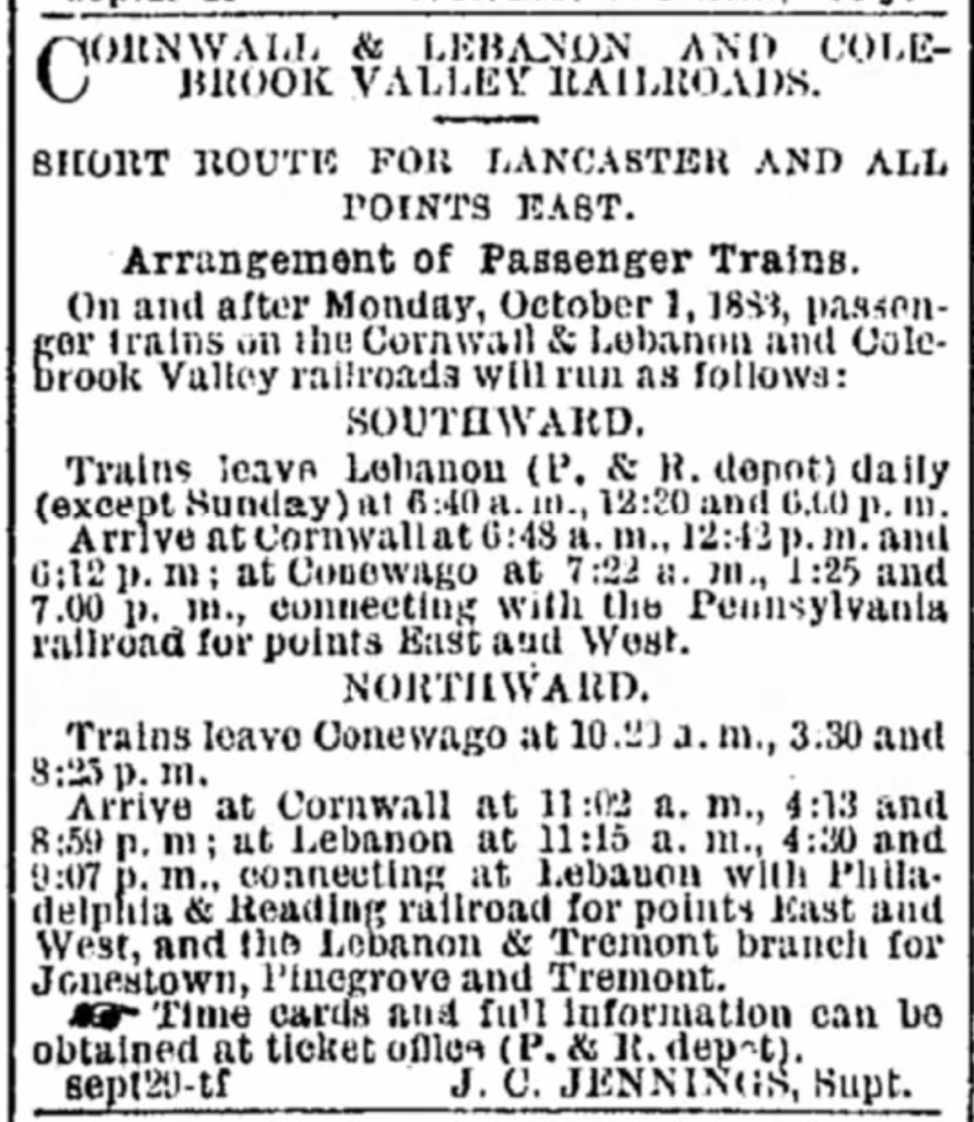Coleman chartered the Colebrook Valley Railroad in January 1881 to run along the banks of the Conewago Creek from Cornwall to Conewago, a distance of about 17.5 miles. About a year later, he proposed a four-mile line — the Cornwall & Lebanon Railroad — to run from Lebanon to Cornwall.