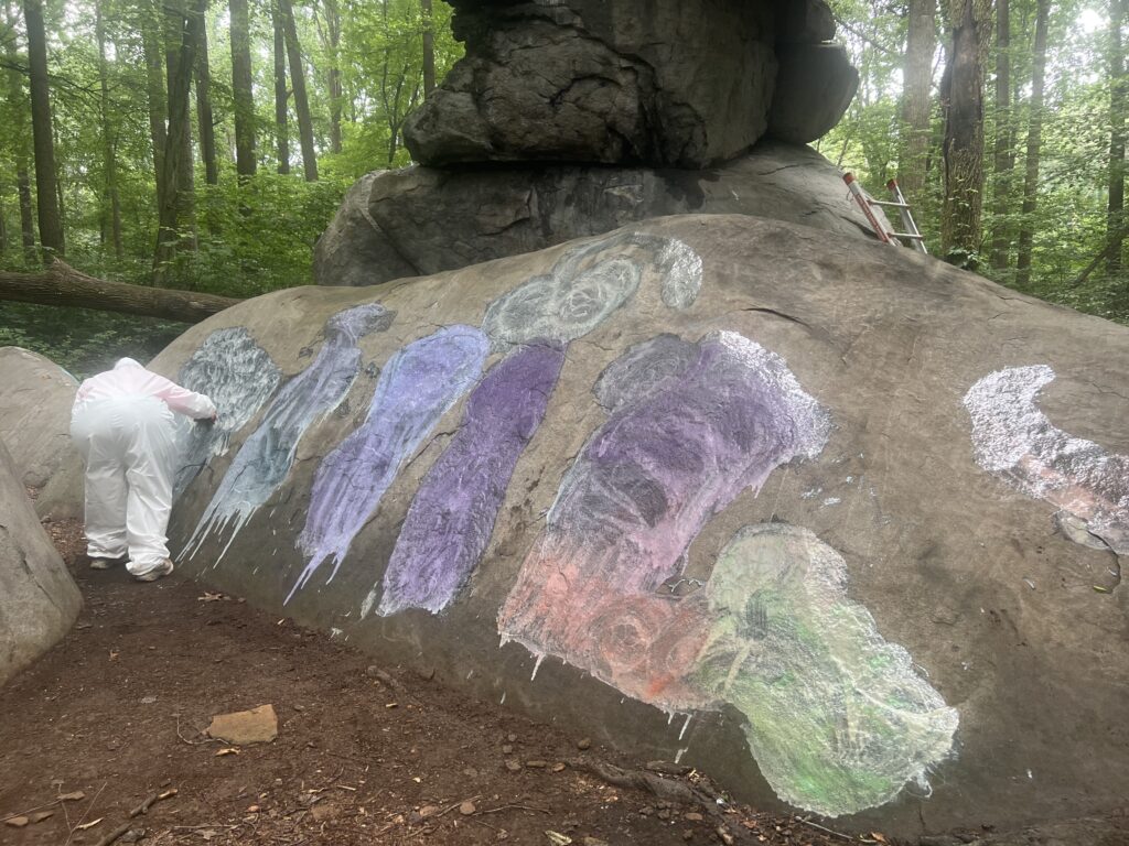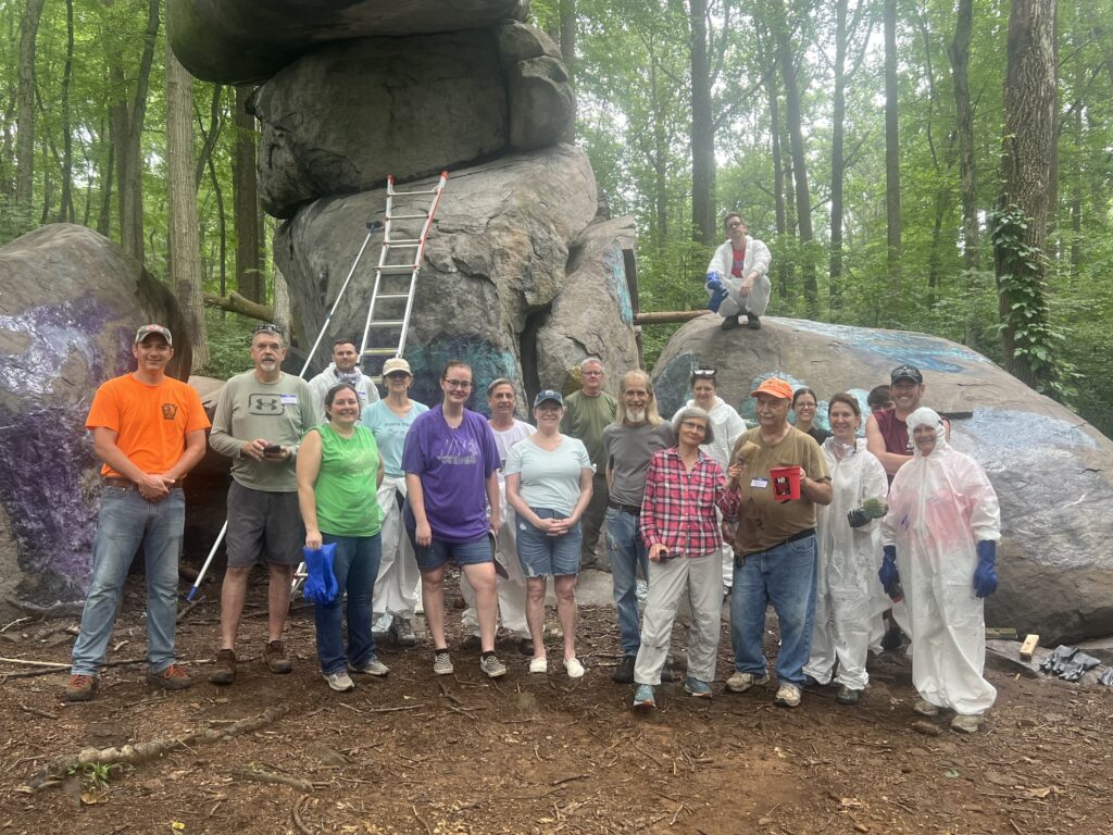 She said the yearly effort started about four years ago when she discovered how badly tagged Dinosaur Rock was. There were multiple layers of paint on the rock surfaces. Years later, and now with the help of the Pennsylvania Game Commission, the rocks are becoming less colorful each visit, she said.