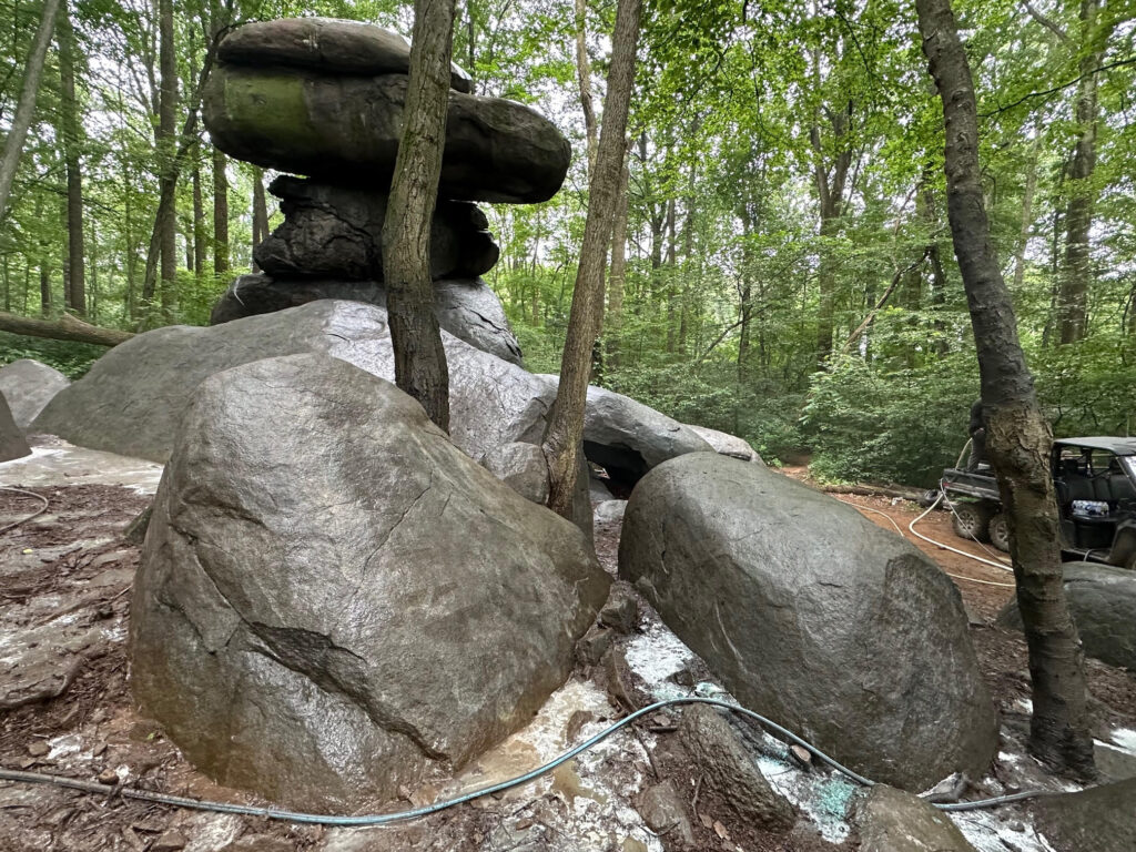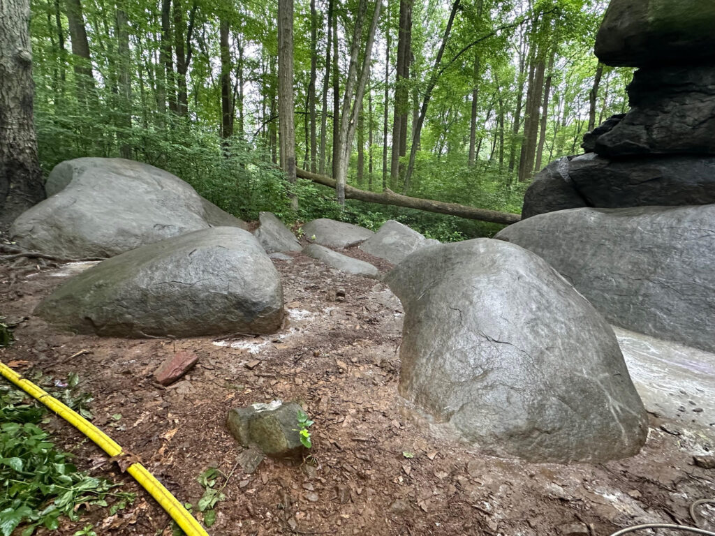 Dinosaur Rock dates back to the early Jurassic period when it formed as a molten injection that cut through the Triassic sedimentary rocks that were there at the time. Those rocks have eroded away, but they left behind the diabase formation, now standing about 15 feet off the forest floor.