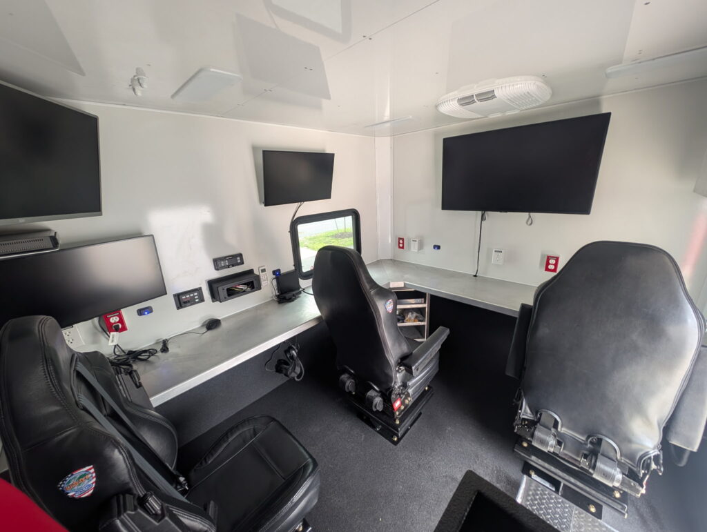 The three-seated command center sits behind the driver’s and passenger’s seats located in the front cab of a Kenworth diesel truck. Dowd said the command center has three computers to serve as an on-location, out-in-the-elements office.