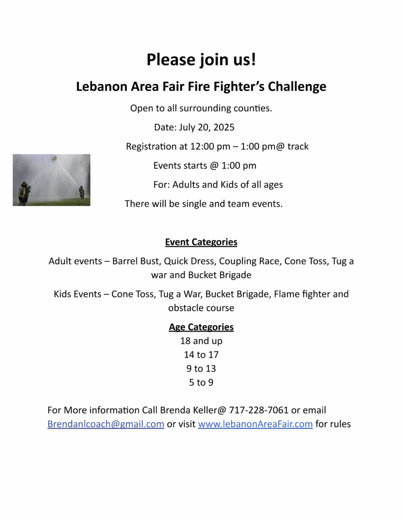 The annual free event, held at 1 p.m. Sunday (registration at noon) at the fairground’s track, is a way for firefighters and would-be firefighters from the Lebanon Valley to showcase their skills across various physical competitions. Participation is open to adults 18 and older and youths ages 14-17, 9-13, and 5-9.