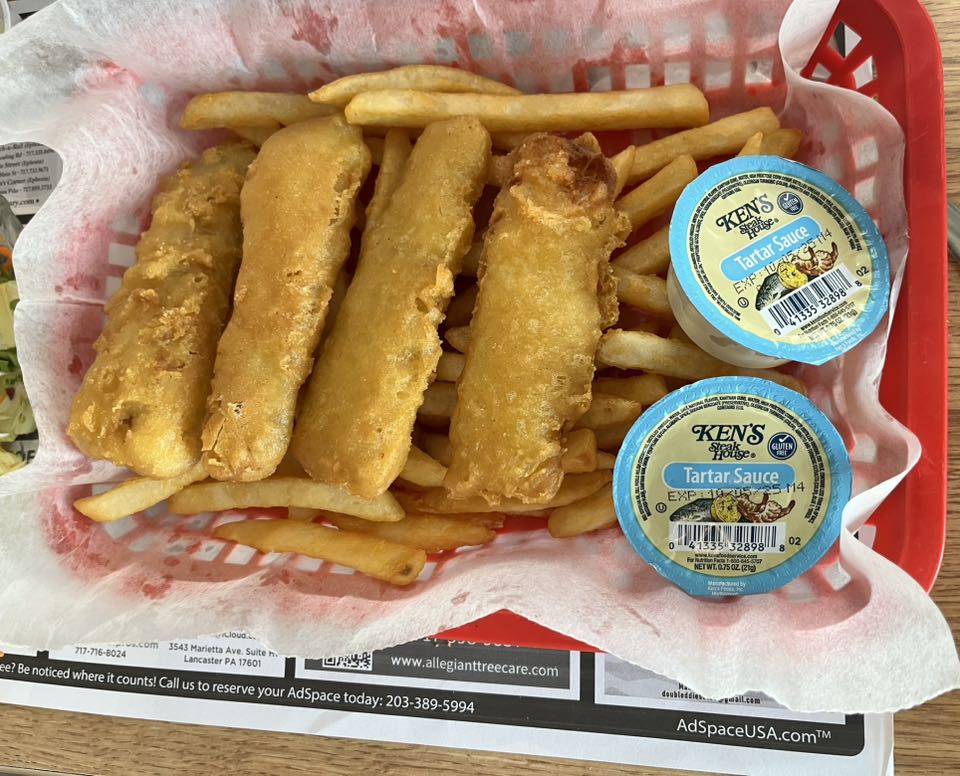 The fish and chips came with four pieces over top of a bed of fries with your choice of tartar or cocktail sauce. The fries are the very crispy kind, and the fish is satisfying in a nostalgic or comfort-food kind of way.