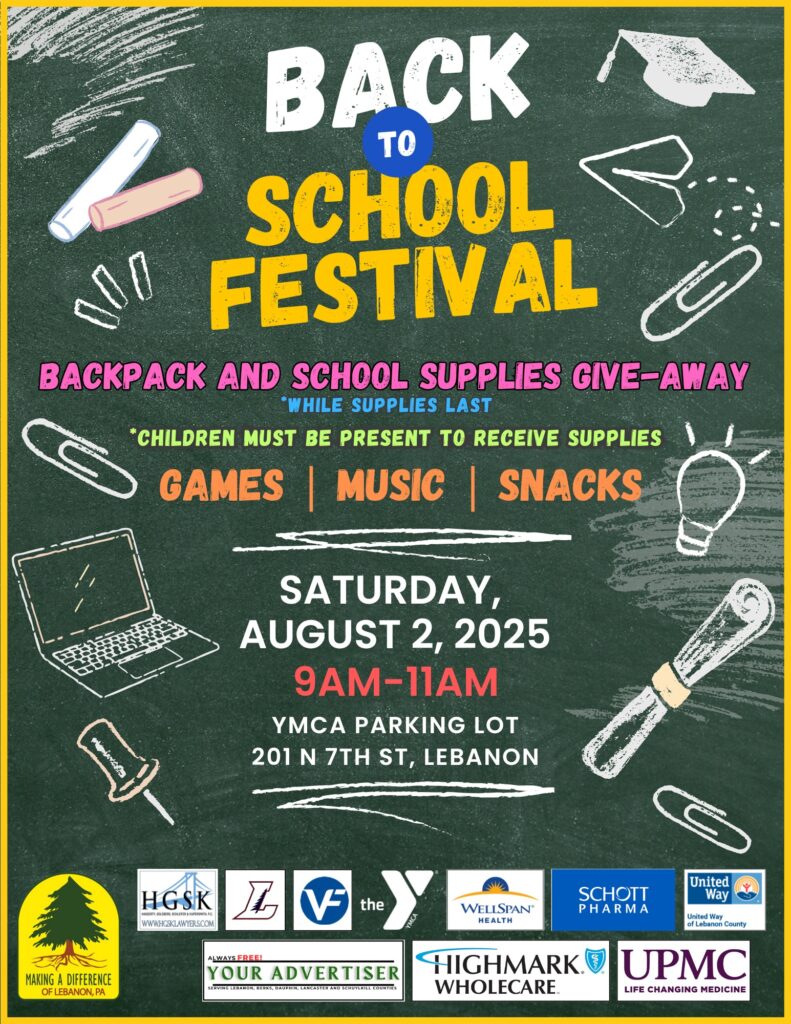 Making a Difference of Lebanon, PA is excited to host the annual Back to School Festival on Saturday, August 2, from 9:00 a.m. to 11:00 a.m. at the YMCA parking lot, 201 N 7th Street, Lebanon.