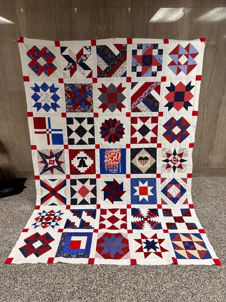 “That (center square) says celebrate ‘250 in the Valley’ with the years,” said Jan. “We took a T-shirt and just cut off the sleeves and everything. We wanted to incorporate something into it so it was not just a patriotic quilter, always lovely, but we wanted to have the purpose of it being the whole visit to the valley for America250.”
