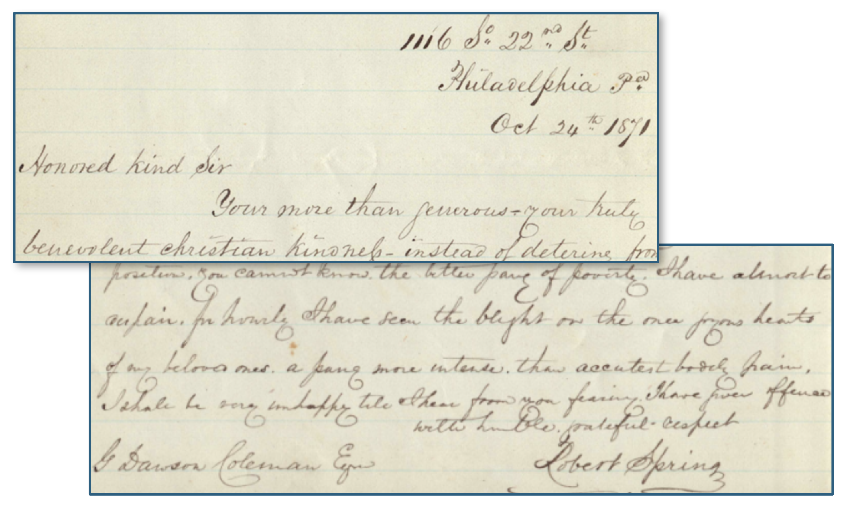 Late in October 1871, Spring writes, “Honored kind Sir, your more than generous… benevolent Christian kindness” has saved his family. He references Coleman’s aid to “thousands of the West,” likely the 100,000 displaced earlier that month by the Chicago Fire (October 8–10, 1871), a disaster that prompted nationwide relief efforts. Coleman’s wealth and connections to President Ulysses S. Grant suggest he contributed funds, aligning with his family’s well-known philanthropy.