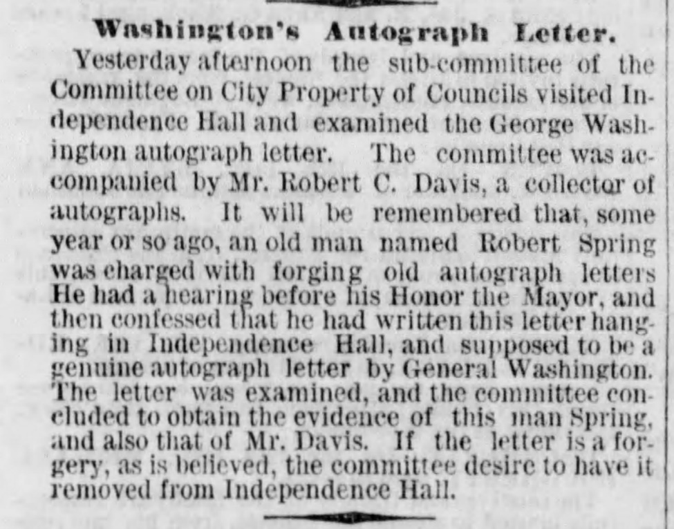 Yet that same month, Spring made news in Philadelphia. One of his George Washington forgeries was discovered hanging in Independence Hall!