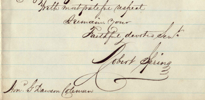 Spring closes his letter, “I can never forget your goodness to me. God bless you for it. My store is now paying and I feel easier in mind than I have for many years – to your generous goodness I owe it. With most grateful respect, I remain your Faithful, devoted Servant, Robert Spring.”