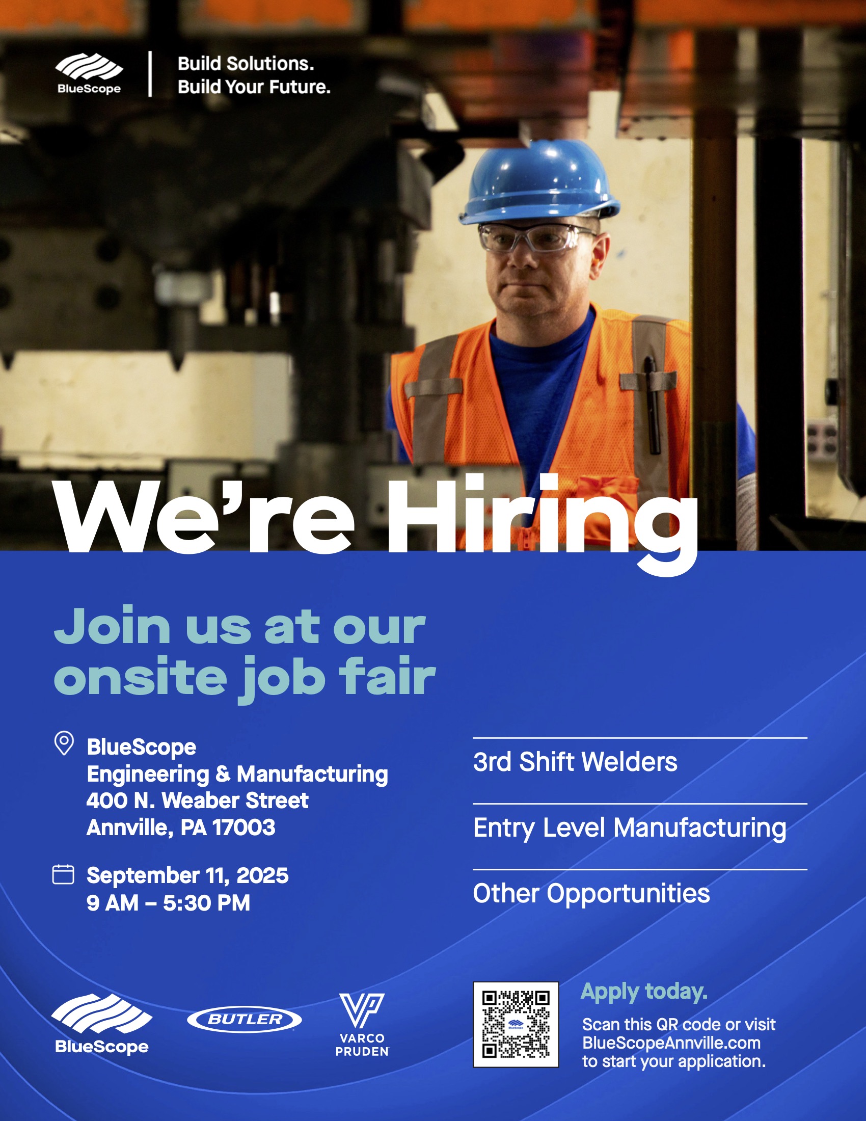 BlueScope is having an ONSITE HIRING EVENT on Thursday, September 11, from 9 a.m. to 5:30 p.m. at 400 N. Weaber Street, Annville, PA 17003. We would love for you to attend and interview for your future home!