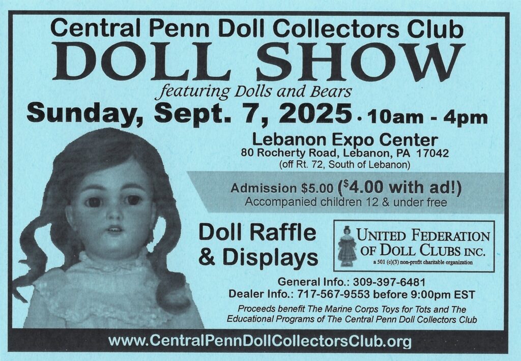 The Central PA Doll Collectors Club hosts its annual Doll Collectors Show on Sunday, September 7, from 10:00 a.m. to 4:00 p.m. at the Expo Center. For just $5 admission ($4 with any ad, children under 12 free with an adult), guests can browse an incredible variety of antique, vintage, modern, reborn, and artist dolls, along with clothing, furniture, bears, and other childhood treasures.