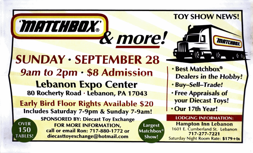 Collectors and hobbyists will gather on Sunday, September 28, from 9:00 a.m. to 2:00 p.m. for the 17th Annual Diecast Toy Exchange. Admission is $8, granting access to more than 150 tables filled with diecast treasures, including Matchbox® favorites. Attendees can buy, sell, trade, and even bring items for free appraisals. Promoted as the largest Matchbox show in the hobby, this event is a must for diecast enthusiasts.