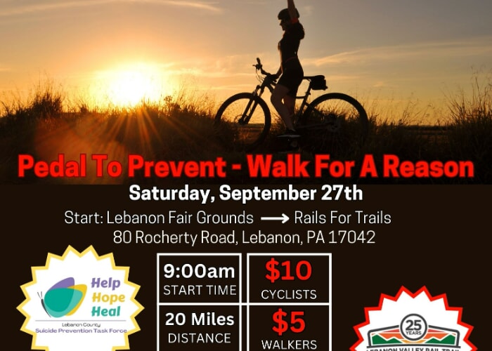 Join us to raise funds for the Lebanon County Suicide Prevention Task Force! Grab your bicycle or walking shoes and go as far as you can up to 20 miles! Cyclists we ask for a donation of $10 & walkers we ask a donation of $5. Registration opens at 8 a.m. at the Lebanon Fair Grounds and the ride will continue to the Rails For Trails. Please be aware of the gravel at some parts of the trail. Go your own distance – every step and pedal counts!