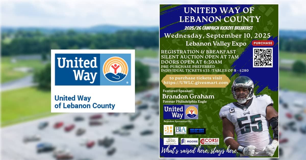 United Way of Lebanon County will launch its 2025-26 fundraising campaign with a breakfast featuring former Philadelphia Eagle Brandon Graham on Sept. 10 at the Lebanon Valley Expo Center.