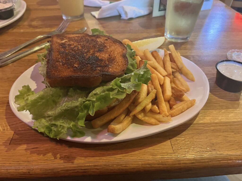 The farm burger comes with cheddar jack cheese, bacon, lettuce, tomato and an over-easy egg on sourdough bread. This thinner patty came with two slices of tomato and a light covering of mayo. The burger tasted good, and the sourdough came with an evenly grilled crisp.