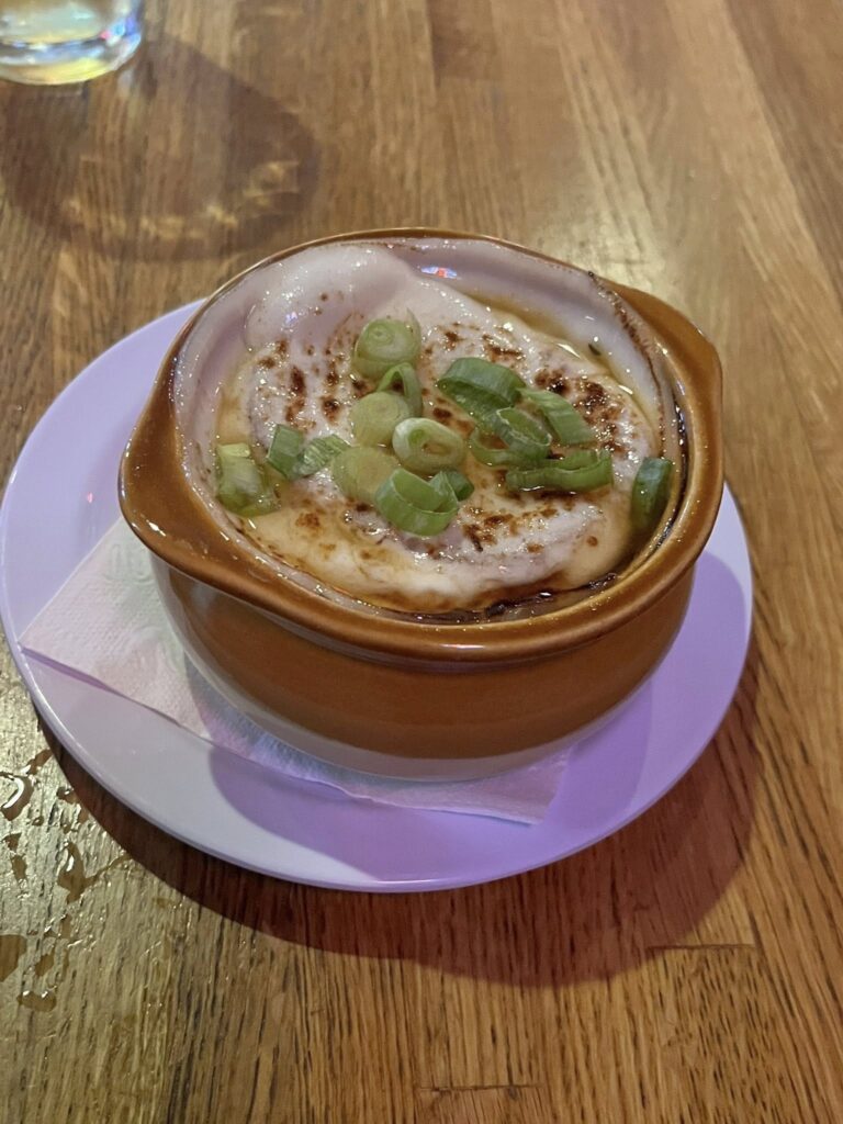 Our French onion soup came adorned with scallions, a heavy amount of cheese and a single large crouton inside. Rich with flavor, this soup hit the spot, even on a hot day.