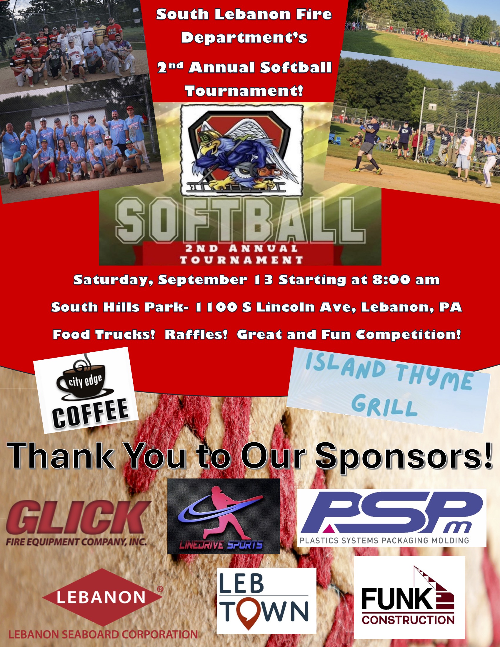 City Edge Coffee and Island Thyme Grill will provide food for spectators and players throughout the day. The department will display several pieces of SLFD fire apparatus and raffle softball gear during the event.