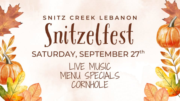 Snitzelfest is where good vibes and great bites collide! Join us on Saturday, Sept. 27, all day at Snitz Creek in Lebanon! We’re featuring Bryan Stevenson from noon to 3 p.m. and TH3M from 6-9 p.m., playing live. Add in cornhole, tasty cocktails, and seasonal food specials, and you’ve got a perfect Saturday! Save the date — it’s going to be unforgettable!