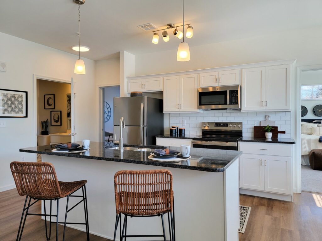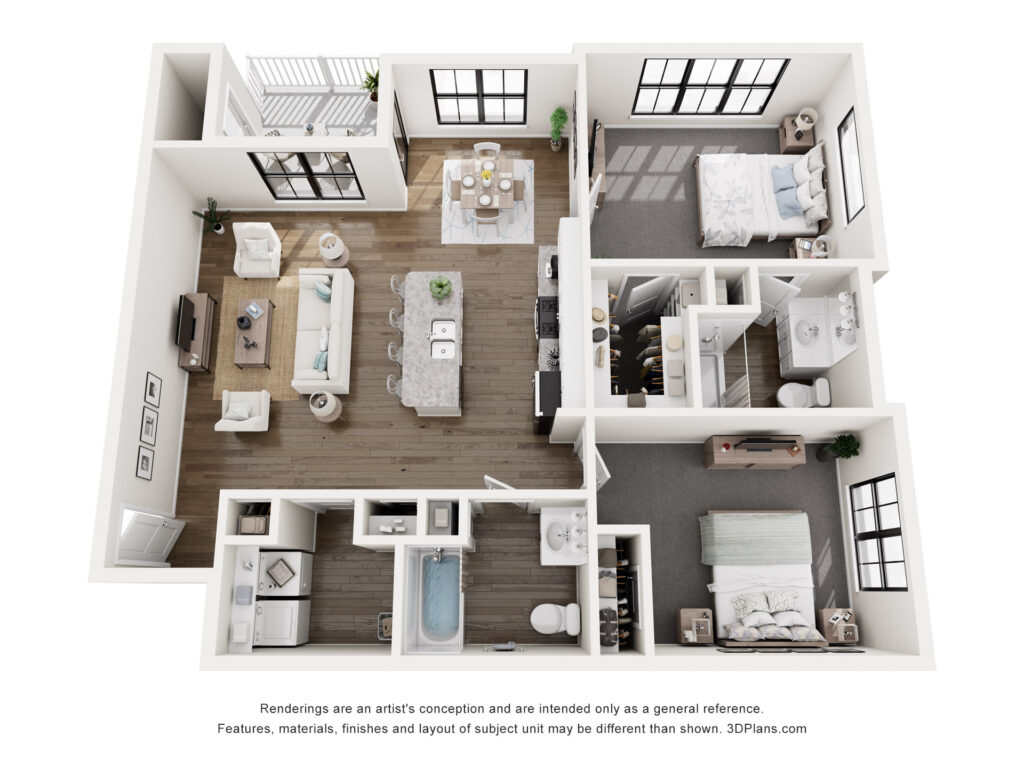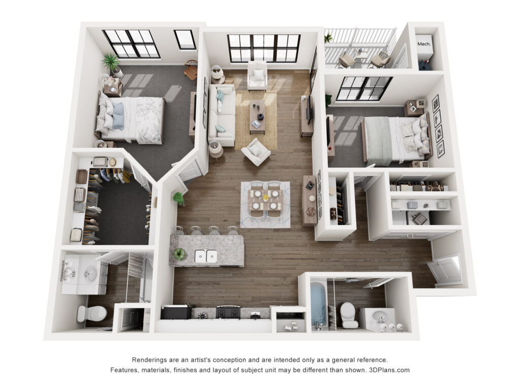 Explore our spacious two-bedroom, two-bath layouts with granite countertops, stainless steel appliances, private patios, and hard-surface flooring.