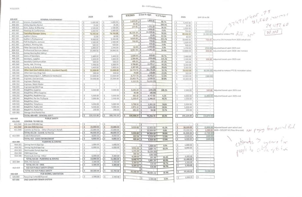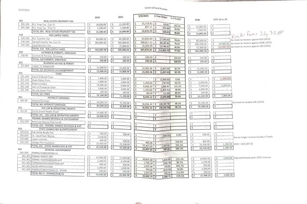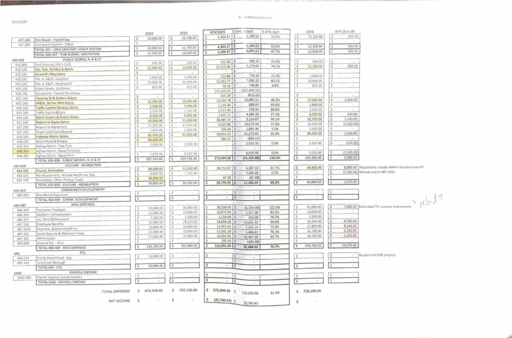 Township manager Erik Harmon explained that, as the township has undergone paving this and last year, the budget does not include paving plans for 2026. The budget includes $269,300 in other road maintenance, including oil & chip and drain tiles, paid for with $116,900 from state liquid fuels and $152,400 from the gaming fund.