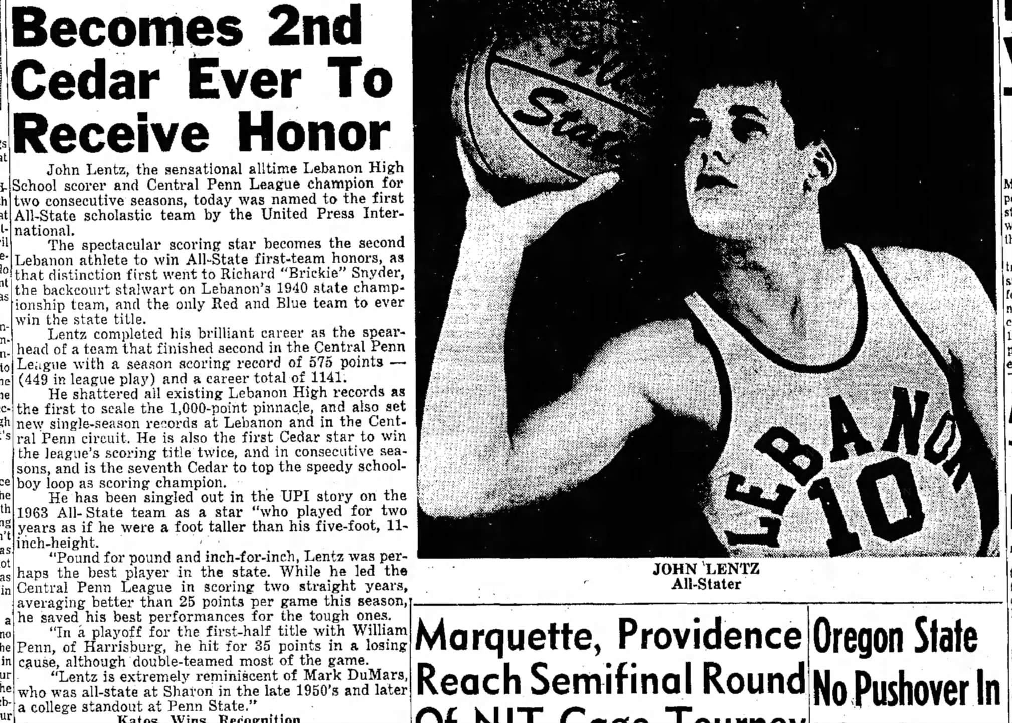 A March 20, 1963, article in the Lebanon Daily News noted that Lentz was only the second Lebanon Cedar basketball player to be named to the “All-state scholastic team by United Press International.” The story states that Lentz was Lebanon High School’s all-time leading scorer and Central Pennsylvania League champion for two consecutive seasons.
