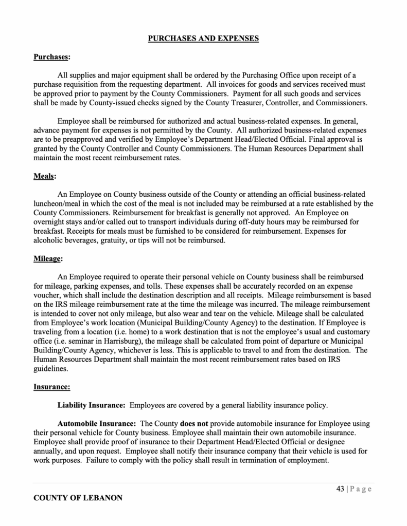 Page 43 of the Lebanon County Employee Handbook states under the heading Purchases and Expenses that: