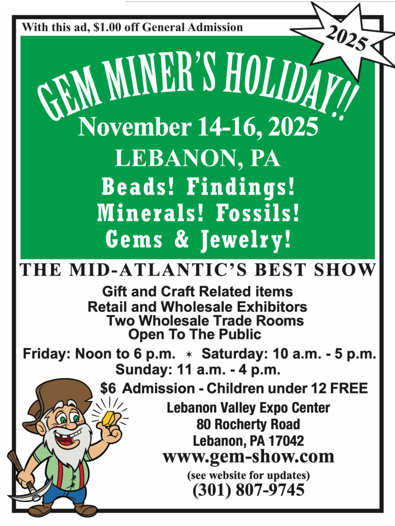 Gem Miner’s Jubilee, Holiday and Spring Shows are yearly exhibitions and sales of some of the foremost products & collectibles of Earth’s treasures. The three-day August show, a Holiday Gift Show in November, and a Spring Show in Howard County MD provide an opportunity to meet source dealers bringing the finest collections available.