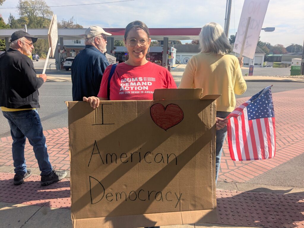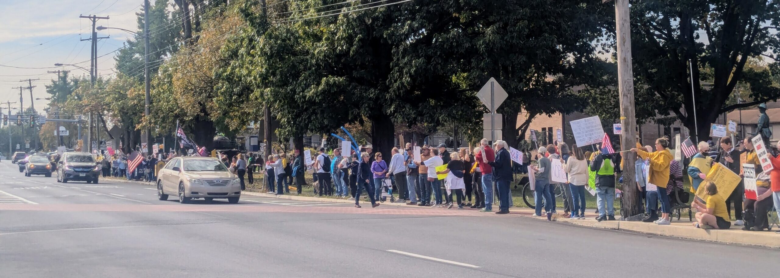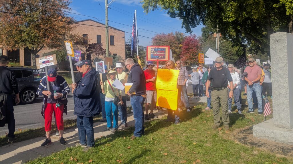 Protestors spanned the length of Fisher Veterans’ Memorial Park in Lebanon on Saturday morning, Oct. 18, lining the street’s edge with protest signs and American flags in opposition to the Trump administration.