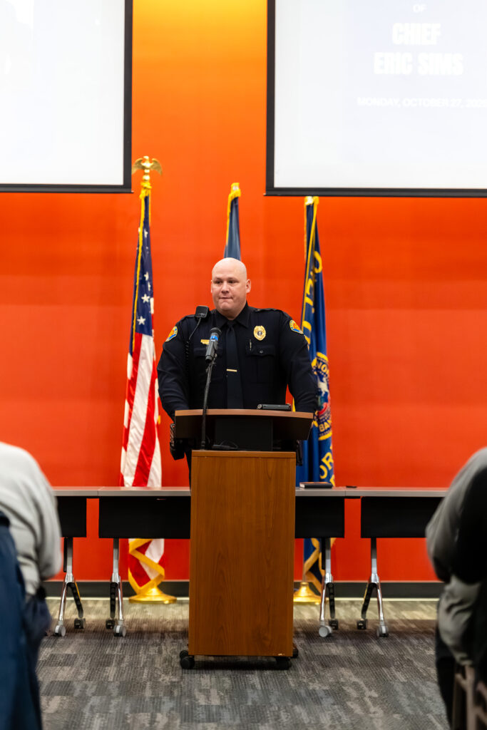 “When I was growing up, my grandfather was a police officer. As far back as I can remember, I watched him put on his uniform and knew that that’s what I wanted to do,” Sims told a crowd of about 75 attendees. “He was a pillar of strength, not just for his community, but especially for his family. As a child, I admired that he protected people from the bad guys. But as I grew older, I came to respect his honesty, integrity, work ethic, and desire to always do the right thing for the right reasons. I knew I wanted to be just like him.”