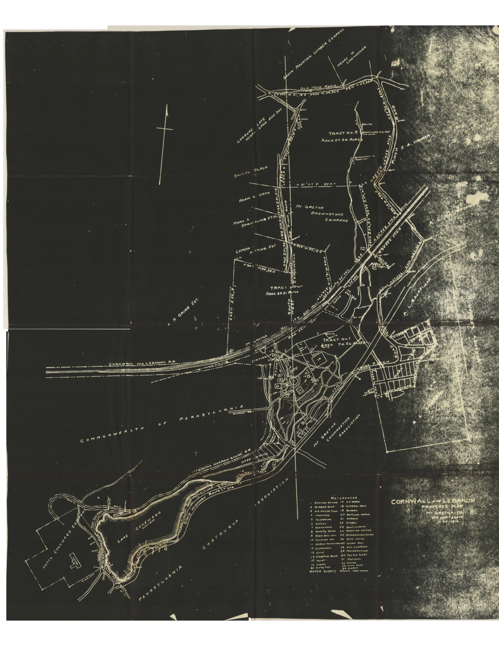 A maze of crisscrossing lines, a cluster of tiny hand-drawn shapes and a numbered list of “References” — these appear on a “1916 Cornwall and Lebanon Property Map, Mount Gretna, Pa.”