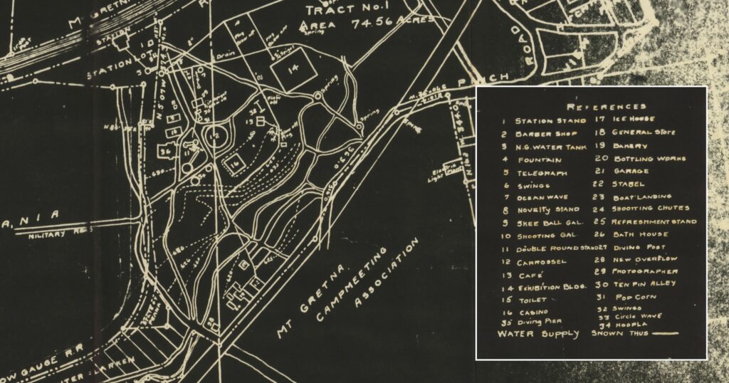 Nothing is known about who drew and labeled the 30” by 36” map and what prompted its creation. Both the Lebanon County and Mount Gretna Area historical societies have copies of the map that likely started as a blueprint.