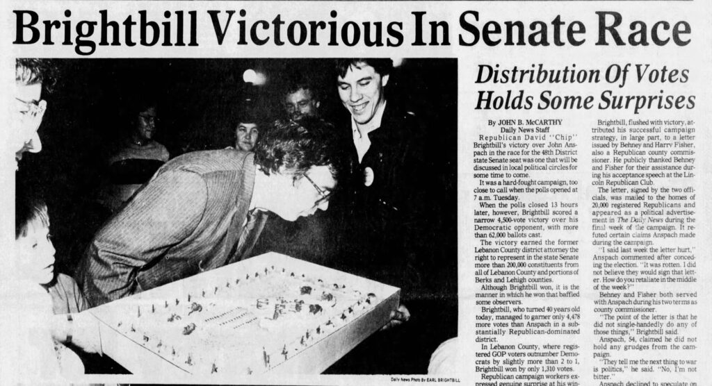 On Nov. 2, 1982, a day before his 40th birthday, Brightbill was elected to the Pennsylvania State Senate’s 48th district, defeating Democrat John Anspach, a two-term Lebanon County Commissioner. Brightbill succeeded Fredericksburg Republican Clarence Manbeck, the founder of Farmers Pride Poultry, in the 48th.