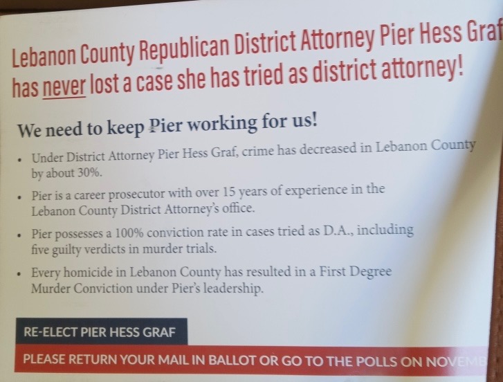 Additionally, during her recent campaign for re-election, information distributed by the Friends of Pier Hess Graf Election Committee touted that crime in Lebanon County was down by 30% under her watch. Arrests are down 31.47%, according to the commonwealth’s Uniform Crime Reporting System.