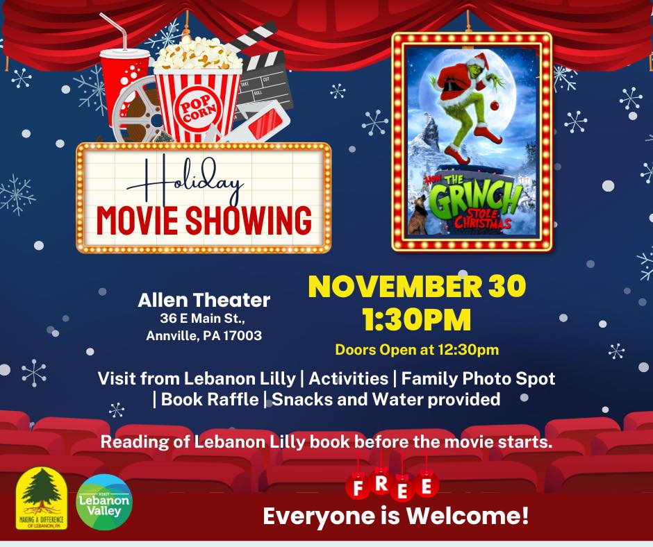 Children and families are invited to join us on Saturday, November 30 at 1:30 p.m. (doors open at 12:30) for a Holiday Movie Showing of How the Grinch Stole Christmas at the Allen Theater. The event will feature a visit from Lebanon Lilly, fun activities, a family photo spot, a book raffle, and free snacks and water. Everyone is welcome!