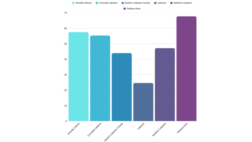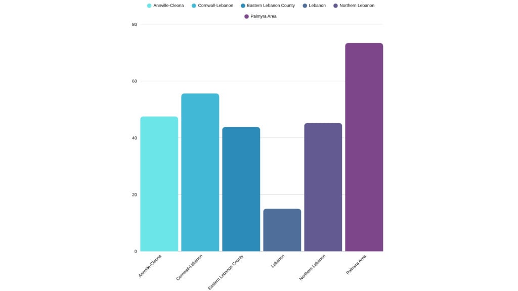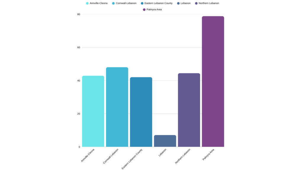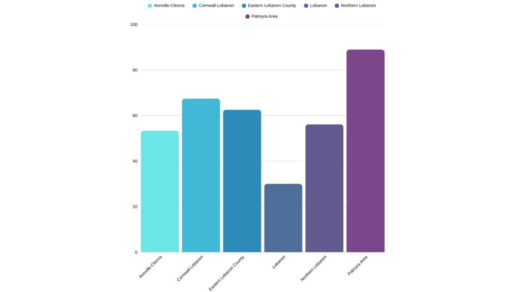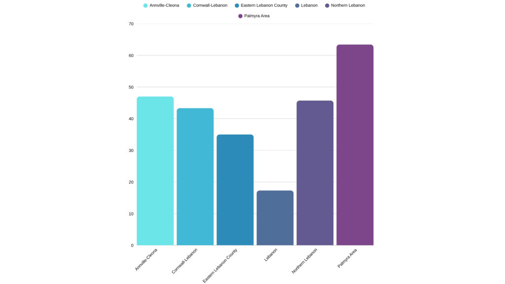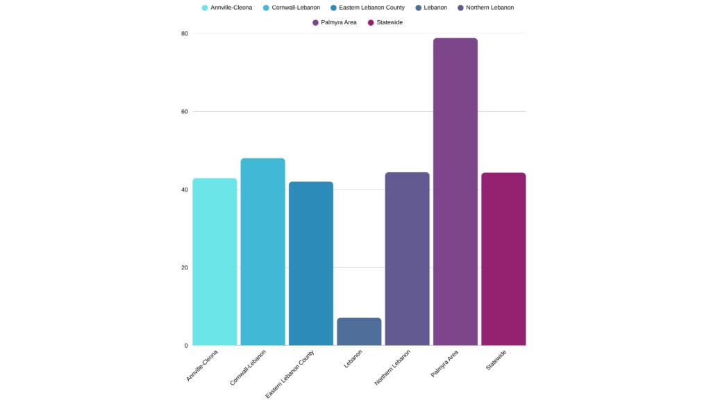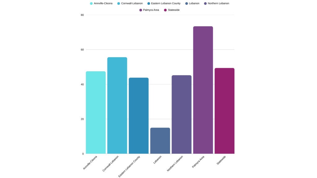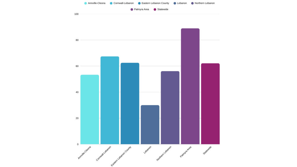 When compared to the statewide averages, Palmyra and Cornwall-Lebanon scored above average on each test. Annville-Cleona scored above average on both PSSA tests. Northern Lebanon County scored above average on the math PSSA and the Algebra I Keystone Exam, and Eastern Lebanon County scored above average on the literature Keystone Exam. Lebanon scored below the statewide average on every PSSA and Keystone Exam.