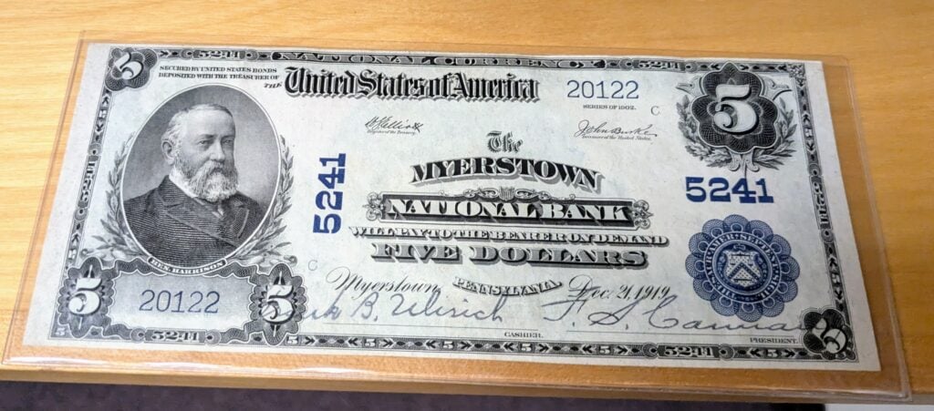 Other artifacts date back to Myerstown’s history of financial institutions, such as currency printed by Myerstown National Bank.