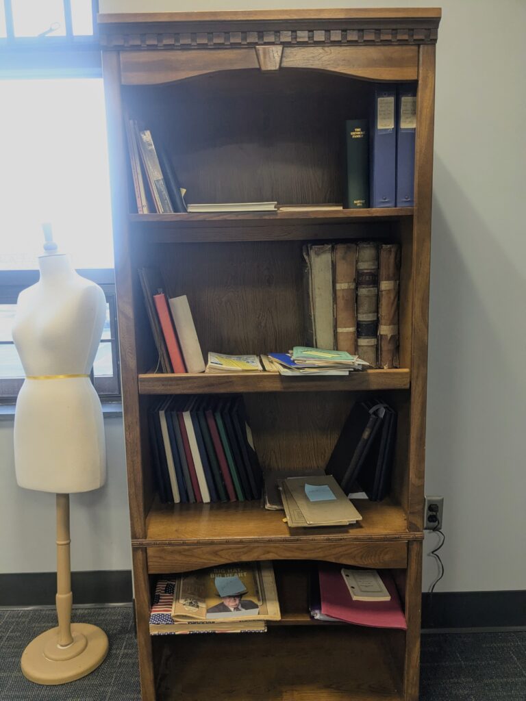 One bookshelf contains a variety of yearbooks from Myerstown High School dating before ELCO School District, as well as other literature relevant to local history.